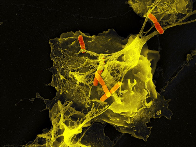 Microscopia eletrônica de varredura mostra neutrófilo estimulado com NETs e bactérias Shigella aprisionadas (imagem: Max Planck Institute for Infection Biology)