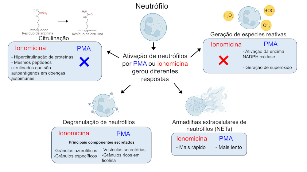 Os ativadores ionomicina e PMA atuam de formas diferentes nos mecanismos de defesa empregados pelos neutrófilos em processos infecciosos (gráfico: Redoxoma/IQ-USP)