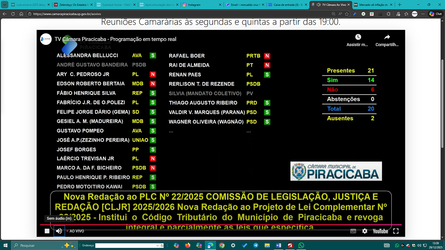 Foi aprovado agora há pouco, por volta das 13h40, pela Câmara de Vereadores de Piracicaba, o PLC 22/2025, que trata do novo código tributário. Foram 14 votos favoráveis e 6 contrários. O debate para se chegar à votação iniciou por volta das 10 horas e foi bem intenso.