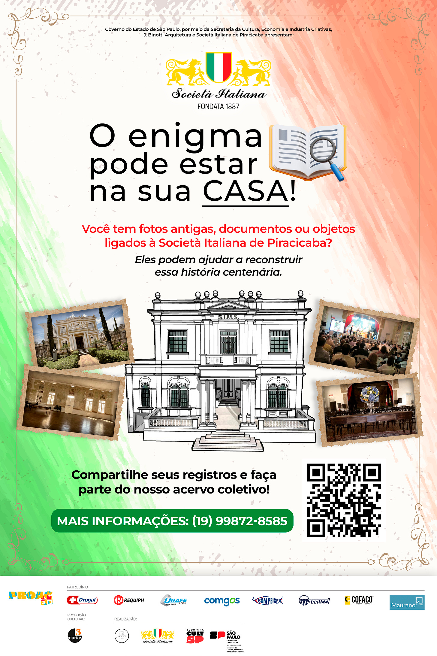 A campanha “O Enigma pode estar em sua casa” pretende reunir documentos históricos que possam contribuir para o Projeto Técnico de Restauro do prédio da Società Italiana di Mutuo Soccorso, na Rua Dom Pedro I, nº 781, Centro de Piracicaba