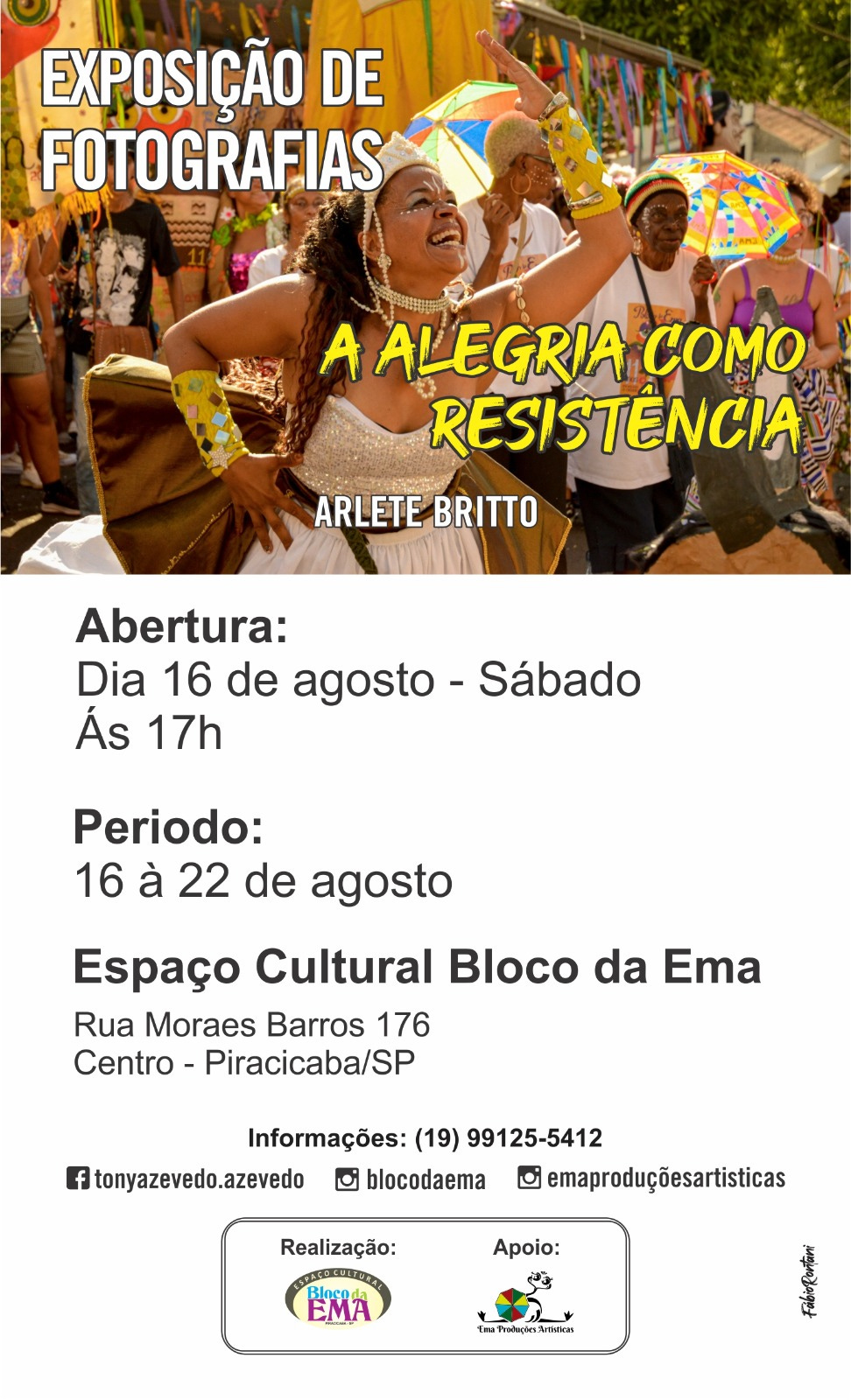 Como parte da programação do mês “Cultura Popular Viva!!”, o Espaço Cultural Bloco da Ema tem a honra de receber a exposição de fotografias "A Alegria como Resistência", da fotógrafa Arlete Britto.