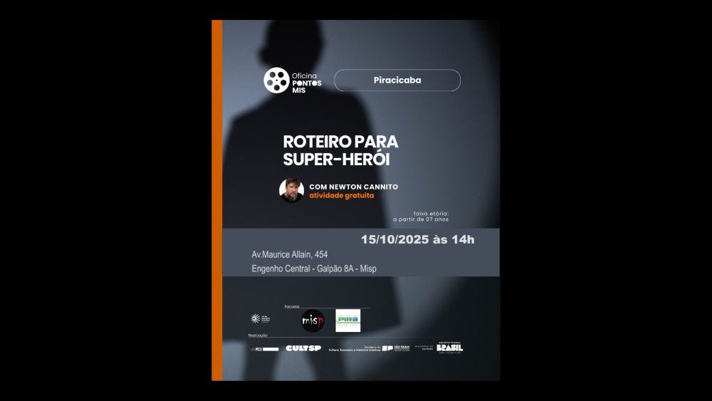 SERVIÇO – Oficina Roteiro para Super-Herói. No Museu da Imagem e do Som de Piracicaba – MISP (Armazém 8A do Engenho Central, avenida Maurice Allain, 454 – Vila Rezende). Amanhã, quarta-feira, 15/10, às 14h. Entrada gratuita.