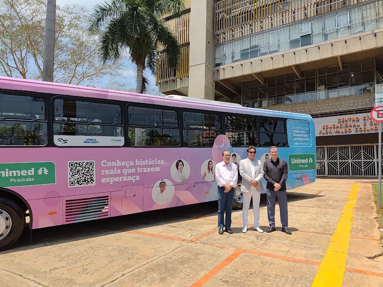 Iniciativa da Unimed, em parceria com a Prefeitura, o ônibus que circula pela cidade foi apresentado no Centro Cívico e faz alusão aos movimentos Outubro Rosa e Novembro Azul