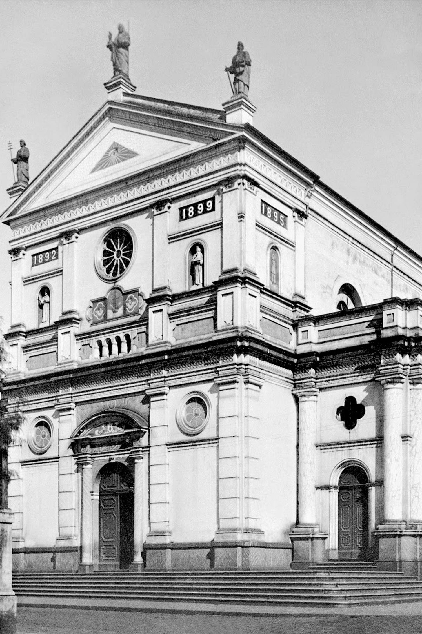 Foto da fachada original, anterior a 1956. As estátuas dos pináculos foram substituídas, e os dois nichos com as estátuas de São Pedro e São Paulo, segundo a história oral, foram emparedadas (isto é, foi feita uma parede na frente delas, tampando-as); as inscrições com os anos da chegada dos frades a Piracicaba (1889), fundação da igreja (1892) e consagração (1895) foram retiradas; vários outros detalhes foram retirados e substituídos por elementos diferentes ou alisados; a principal diferença foi a substituição do pórtico por outro mais aprofundado, em estilo neogótico.