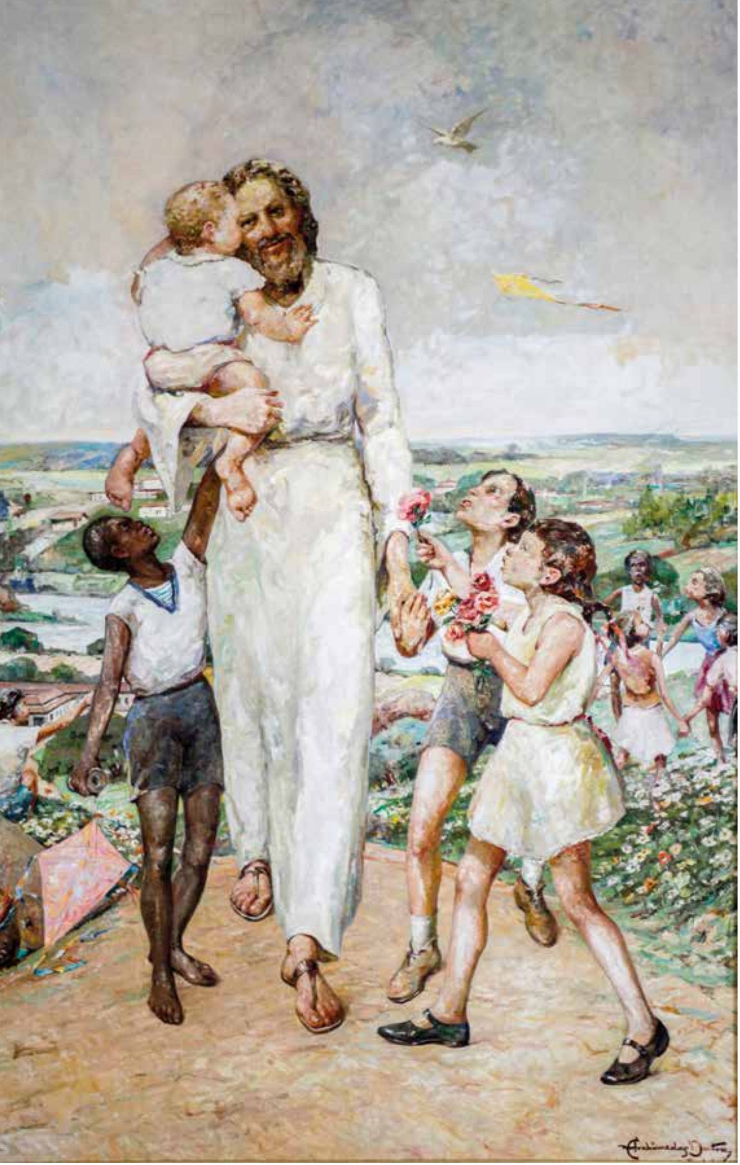 O quadro de Dutra mostra Jesus cercado de crianças com o cenário da Rua do Porto ao fundo.