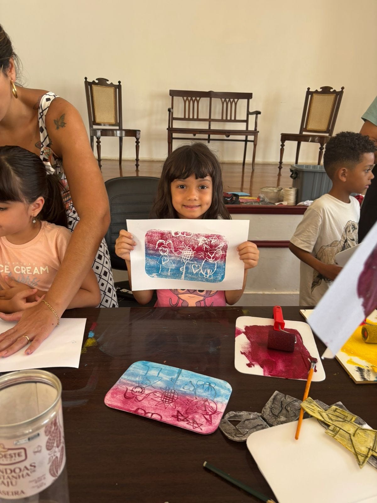 A partir de pequenas histórias, as crianças irão criar seus próprios desenhos, personagens e cenas, transformando ideias em imagens impressas. A atividade estimula o brincar com formas, palavras e texturas, fortalecendo a criatividade e o prazer de criar com as próprias mãos.