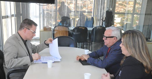 O oncologista Fernando Medina e a gestora Andréia Klefenz durante reunião com o secretário municipal da Saúde, Sergio Pacheco Jr.