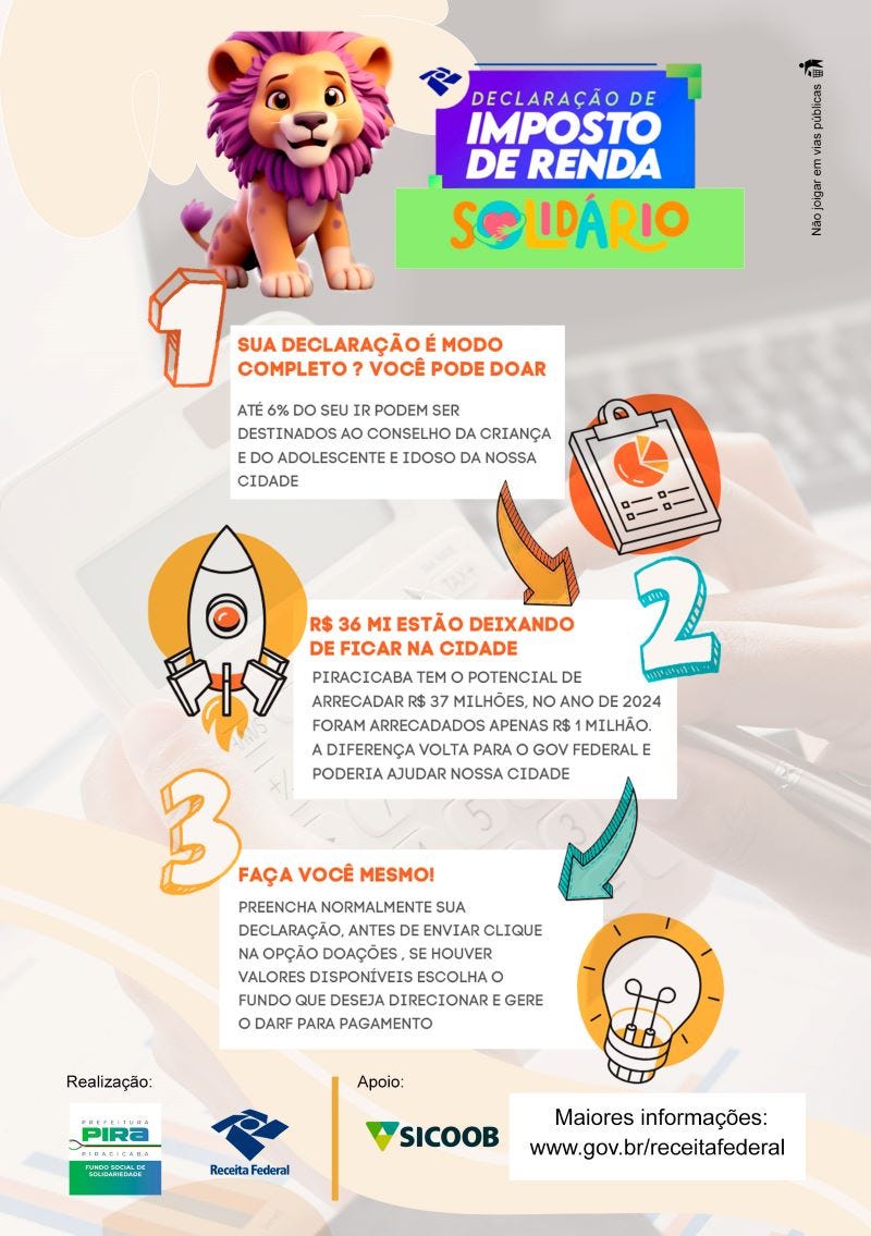 A campanha Declare o Bem 2025, promovida pelo Fundo Social de Solidariedade de Piracicaba, segue até 30 de maio e incentiva a população a destinar até 6% do Imposto de Renda devido a projetos sociais voltados a crianças, adolescentes e idosos. A destinação é feita diretamente no programa da Receita Federal, sem custo adicional, no momento da declaração do IR no modelo completo. Os recursos são aplicados nos Fundos Municipais da Criança e do Adolescente (Fumdeca) e do Idoso (FMI), com fiscalização dos respectivos conselhos.