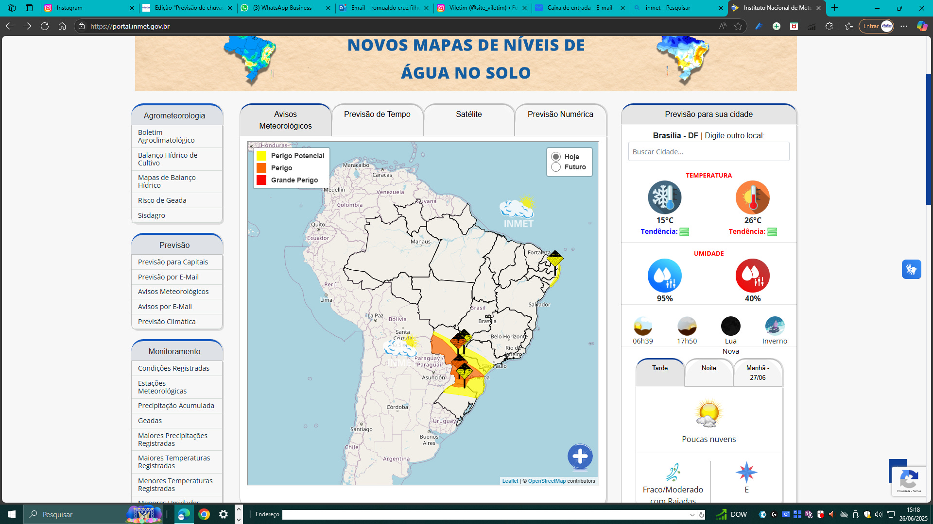Na segunda-feira (30) as condições de chuva no Rio Grande do Sul já estarão bastante enfraquecidas, mas ainda persistem em áreas localizadas do Paraná e de Santa Catarina, sul de São Paulo e do Mato Grosso do Sul. Novas instabilidades, contudo, poderão ocorrer no Rio Grande do Sul entre terça-feira (1/7) e quarta-feira (2/7).