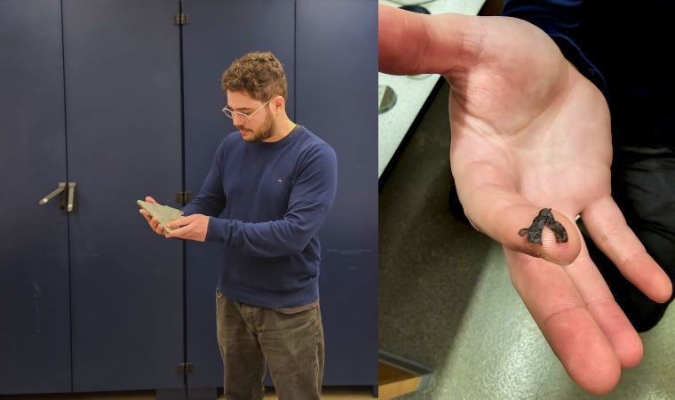 À esq., pesquisador Bruno Becker-Kerber segura amostra de rocha onde fóssil foi encontrado. À dir., o fóssil no formato em que habitou a Terra (foto: acervo pessoal)