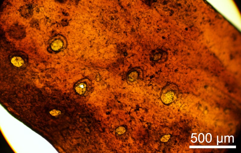 Também foram identificadas micropartículas de cálcio compatíveis com minerais produzidos por liquens atuais como forma de proteção solar, uma evidência inédita em fósseis tão antigos.