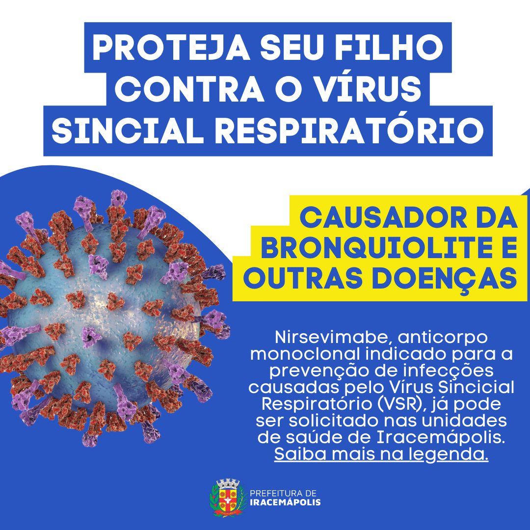 A Secretaria Municipal de Saúde de Iracemápolis iniciou a aplicação do nirsevimabe, um anticorpo monoclonal indicado para a prevenção de casos graves de bronquiolite em bebês e crianças menores de 2 anos ( até 1 ano, 11 meses e 29 dias) . A solicitação do imunizante deve ser realizada nas unidades de saúde, mediante apresentação da documentação comprobatória.
