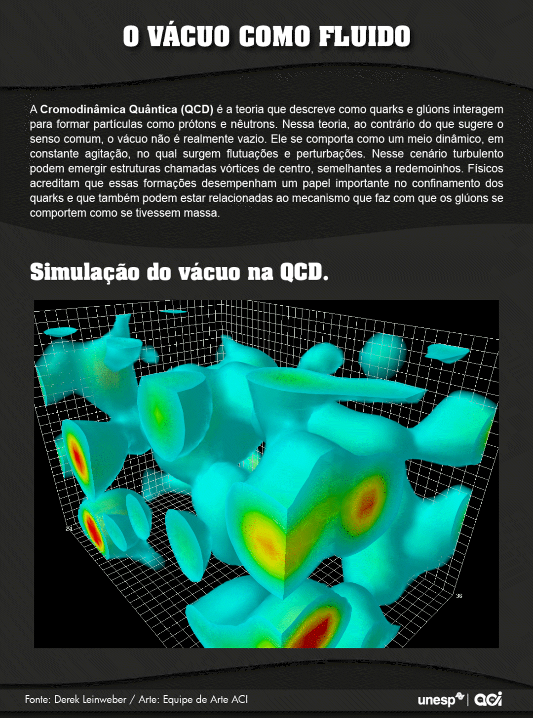 Na física de partículas, ao contrário do senso comum, o vácuo não é espaço vazio. Para entendermos melhor esse conceito, é preciso imaginar como seria o mundo em escalas subatômicas. Os quarks e glúons estão distribuídos em uma determinada área, mantendo distâncias muito pequenas entre si. Por sua vez, esse espaço, que é onde está o vácuo, mais do que um ambiente vazio, se comporta como se fosse um fluido em movimento. “Na verdade, o vácuo não é uma coisa vazia. Ele possui “vida”, tem flutuações. Na teoria quântica de campos, o vácuo é cheio de coisas. É como se fosse um fluido que está em movimento constante”, explica Krein.
