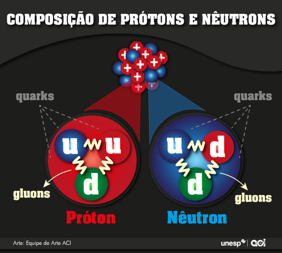 Na prática, funcionam como pequenas peças de Lego que, combinadas de diferentes formas, dão origem a partículas maiores. Por exemplo: um próton é formado por dois quarks do tipo up e um quark do tipo down, ligados por glúons. Um nêutron, por sua vez, é formado por dois quarks down e um quark up, também mantidos conectados por glúons. A palavra glúon, aliás, vem do inglês “glue”, que significa “cola”, e expressa sua função nesse esquema.