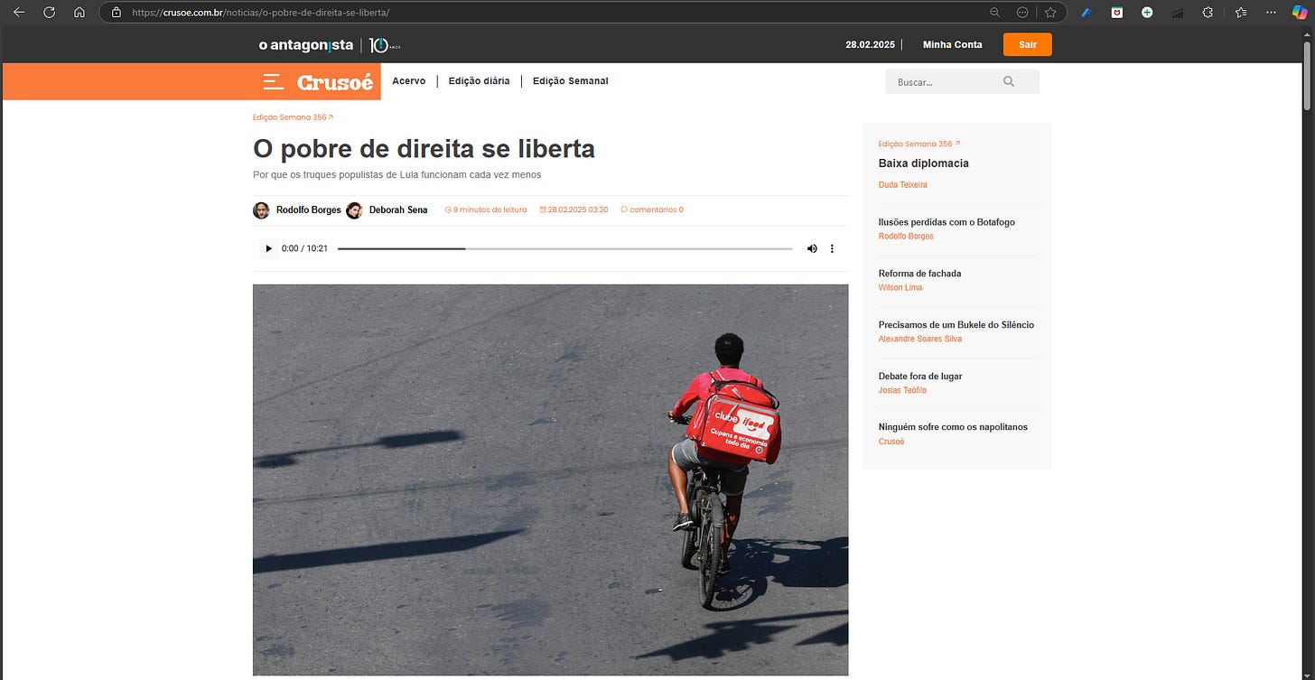 O filósofo Luiz Felipe Pondé, por exemplo, faz uma leitura muito parecida com a que fiz um tempo atrás para o site Viletim (Leia aqui). Ele fala sobre a libertação do “Pobre de Direita” para uma matéria da revista Crusoé (Leia aqui). Pobre de direita é uma expressão que ele criou há quase uma década para definir o perfil do brasileiro que precisa “ir atrás do prejuízo e trabalhar”.