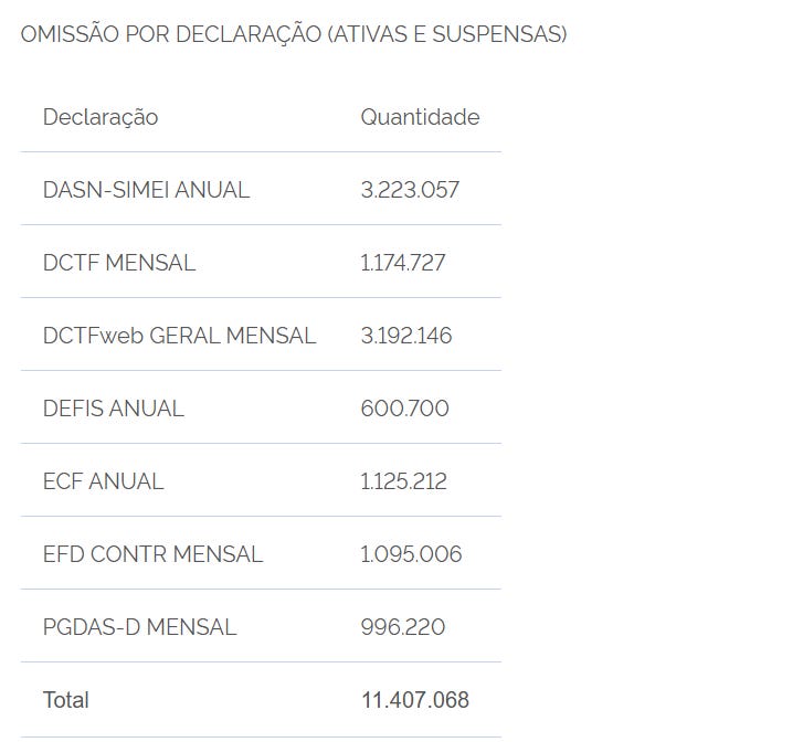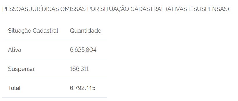 Deste total, 41,67% são MEIs, na maioria que apenas abriram o CNPJ, mas não entregaram nenhuma declaração do MEI (DASN-SIMEI). Boa parte dos CNPJs que são abertos e não enviam nenhuma declaração ou documento fiscal normalmente foram abertos apenas para fruir benefícios de planos de saúde empresarial e compra de carros e motos mais baratos para PJ, sem que houvesse intenção do efetivo exercício de empreendedorismo.