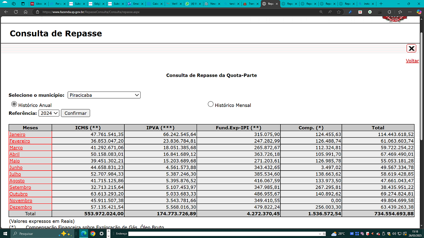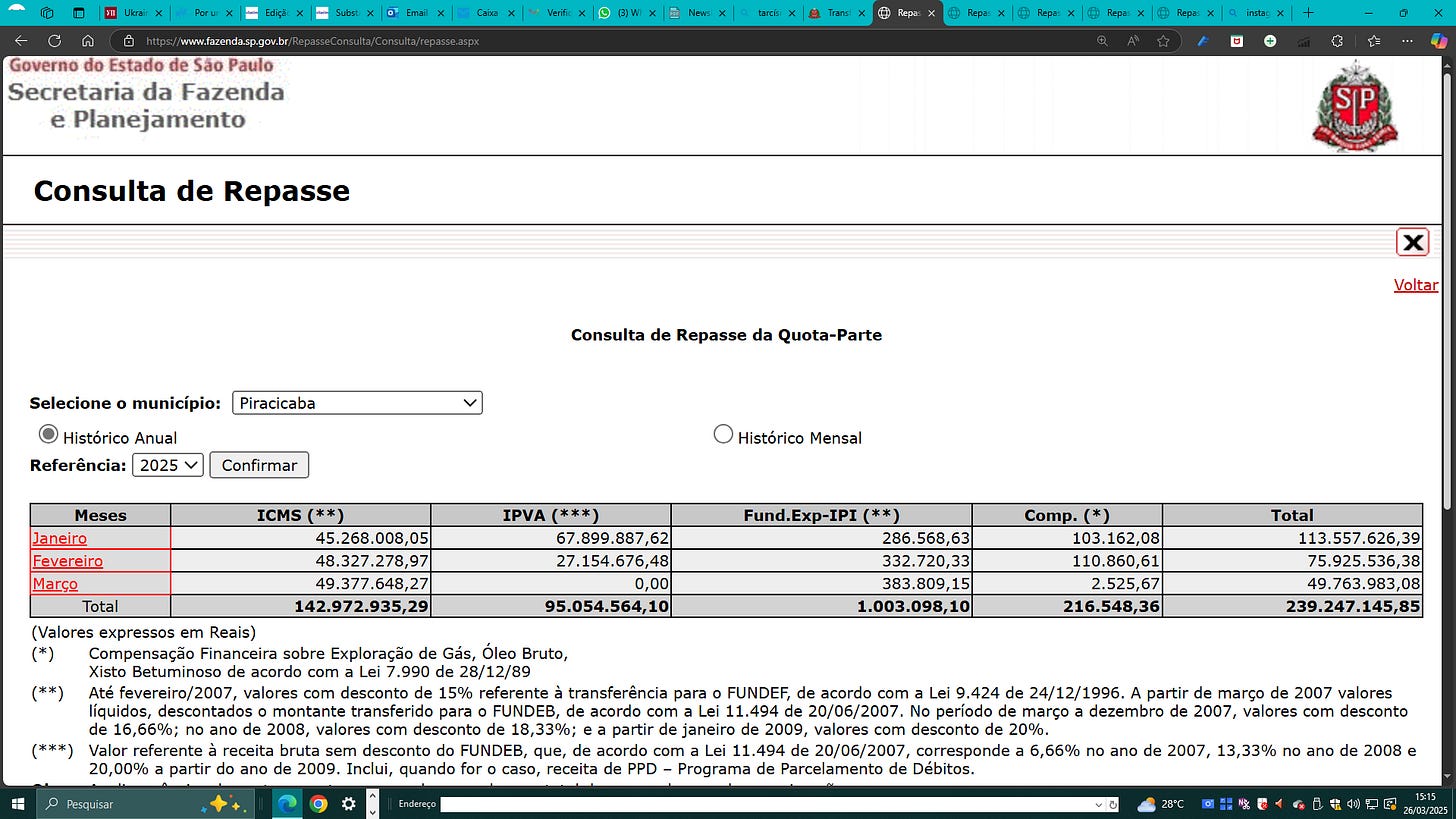 A Secretaria da Fazenda e Planejamento do Estado de São Paulo já transferiu R$ 143 milhões para Piracicaba só em ICMS. A previsão de mais R$ 8 milhões até o final do mês (com repasse no dia 1 de maio), totalizando R$ 151 mi no trimestre.