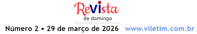 Há ainda textos falando sobre patrimônio histórico, focado nas igrejas da cidade, e indicações de livros e filmes. Viletim é cultura. A Revista de Domingo vem para chamar atenção para esse aspecto, tratado com certa leviandade por aí. Aqui o humor é sério. Difícil até de rir.
