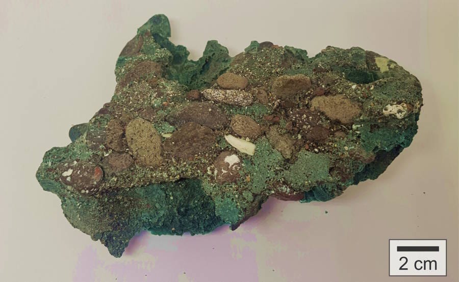 À primeira vista, as amostras encontradas pela pós-doc da Unesp na ilha de Trindade, quando ainda era estudante de doutorado da Universidade Federal do Paraná (UFPR), parecem reproduzir a composição da maioria das rochas encontradas em regiões costeiras, que agregam em um mesmo material diferentes sedimentos, como restos de conchas, areia ou cascalho. Análises feitas em laboratório e publicadas na revista Marine Pollution Bulletin, em 2022, entretanto, apontaram diferentes formas de ocorrência e composição. Enquanto algumas dessas rochas têm o plástico atuando como um cimento que agrega diferentes materiais, como pedaços de conchas, areia e outros sedimentos, outras são compostas majoritariamente por plástico derretido.