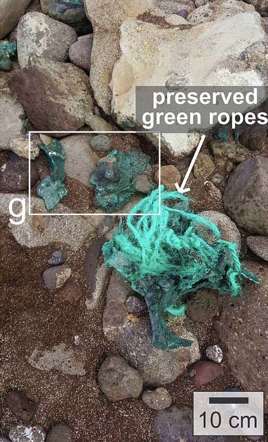 “As cordas chegam pelo mar em grande volume e, depois de queimadas, na maioria das vezes pela ação humana, fundem-se ao material natural que está ali na praia. No caso de uma ilha vulcânica, o material presente ali não se limita a pedaços de conchas ou areia, mas também a fragmentos de rocha maiores. Ao longo do tempo, esse material é erodido pela ação das ondas, da maré, do vento e transportado pelo mar, chegando a outras praias”, resume a pesquisadora. Após serem transformados em mesoplásticos e microplásticos, esses fragmentos se depositam e acabam soterrados. “Essa é a mesma abordagem que observamos na geologia sedimentar”, diz.