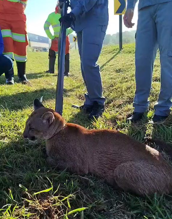 Uma onça-parda (Puma concolor) foi resgatada na manhã de hoje (15), no bairro Santa Rosa (km 28 da Rodovia Fausto Santomauro), em Piracicaba, na pista sentido Rio Claro. O animal, que estava no canteiro lateral, foi identificado pelas equipes da concessionária do trecho, Via Colinas, capturado pelo Corpo de Bombeiros e removido emergencialmente para o Zoológico de Piracicaba. Não houve interdição de faixas nem congestionamento para o resgate.