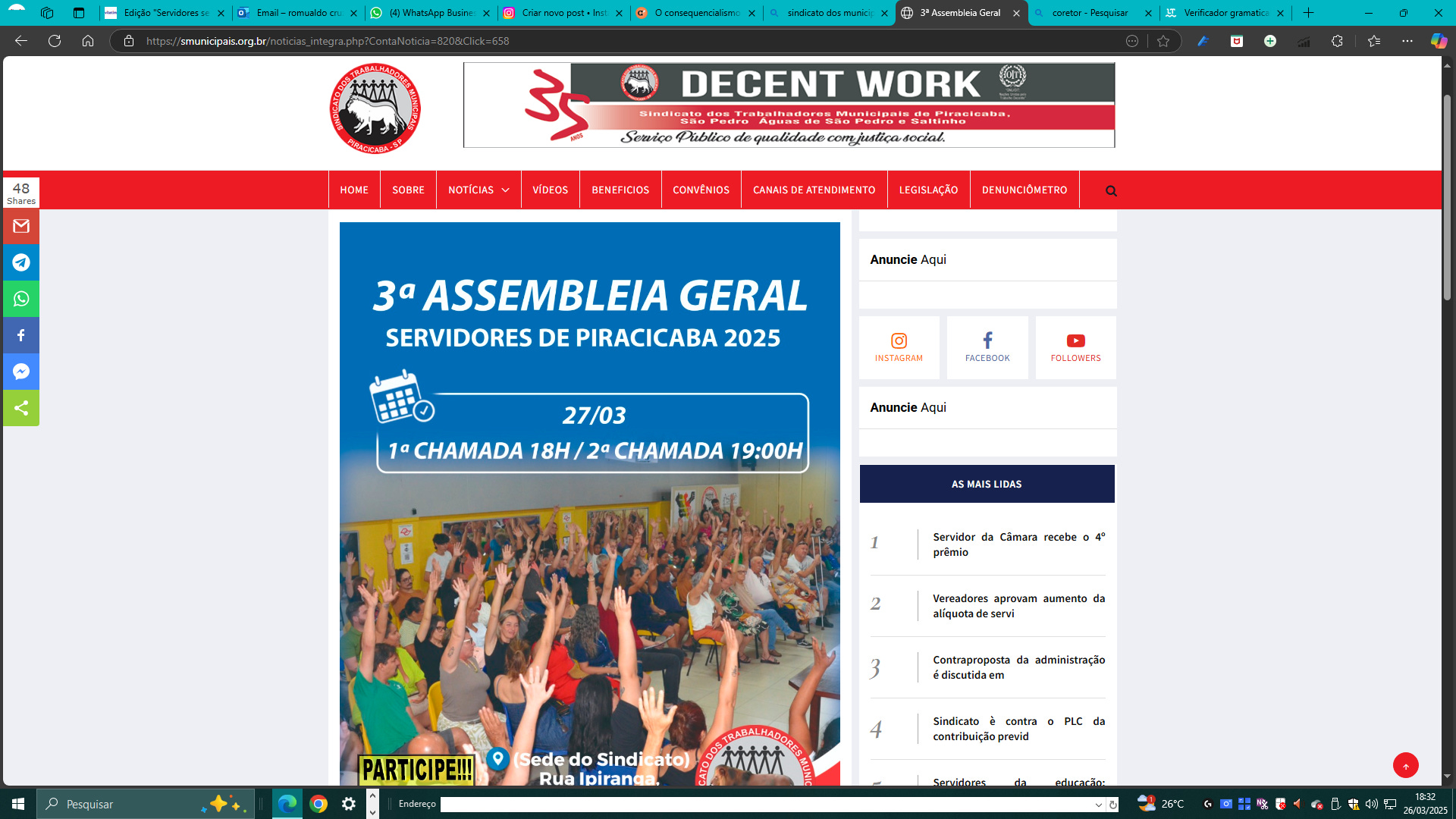 Será realizada amanhã (27), às 18 horas, na sede do Sindicato dos Municipais, a 3ª assembleia-geral dos servidores municipais de Piracicaba, como parte da campanha de negociação salarial da categoria. Ao final do encontro, será feita uma passeata até à Câmara Municipal, onde os vereadores estarão realizando sessão.