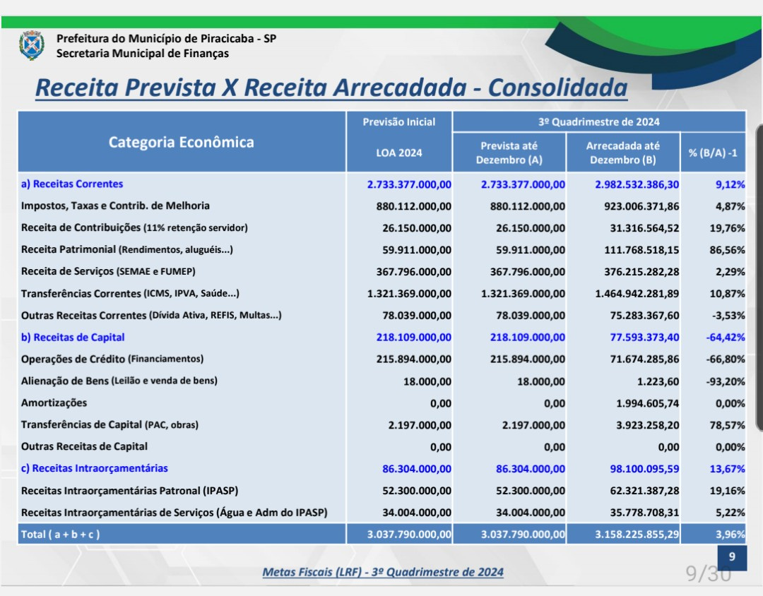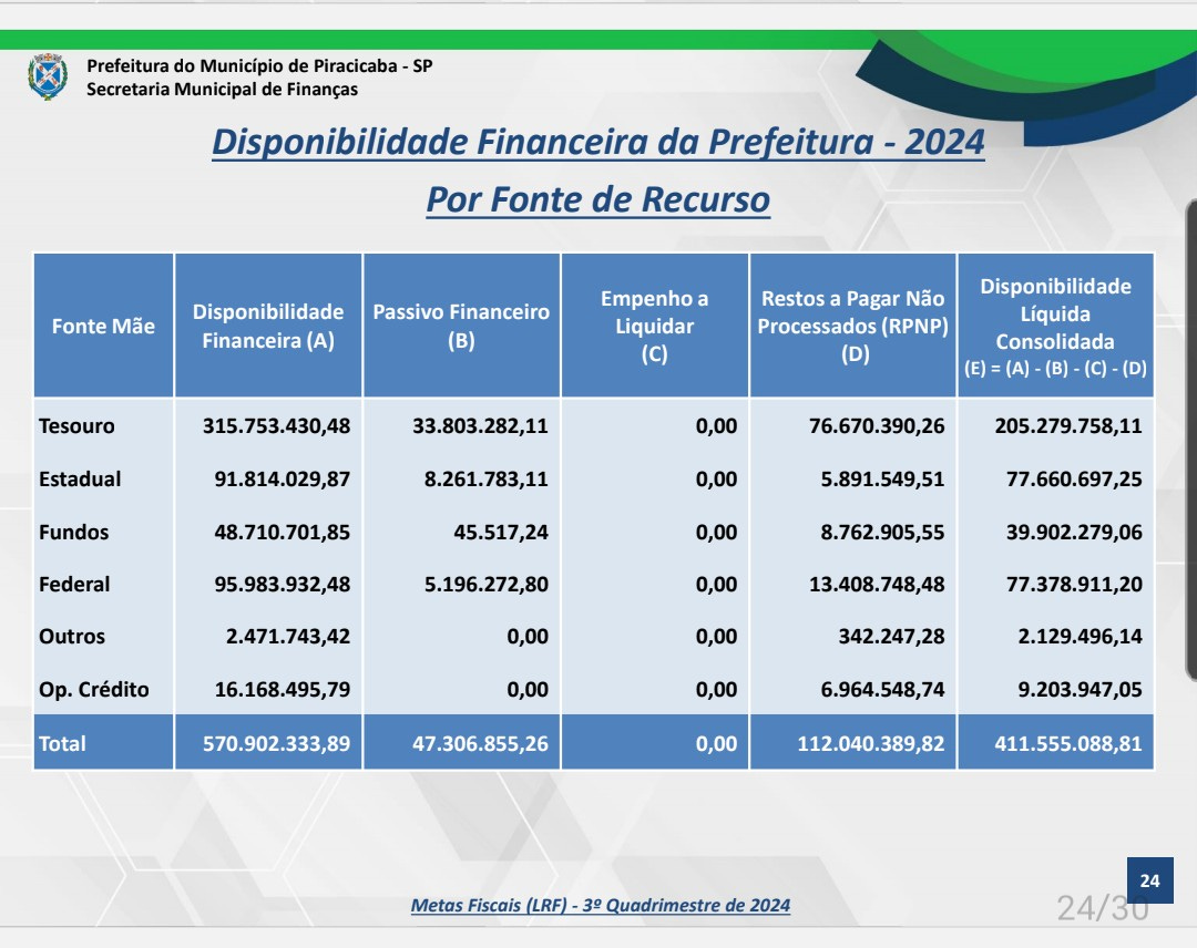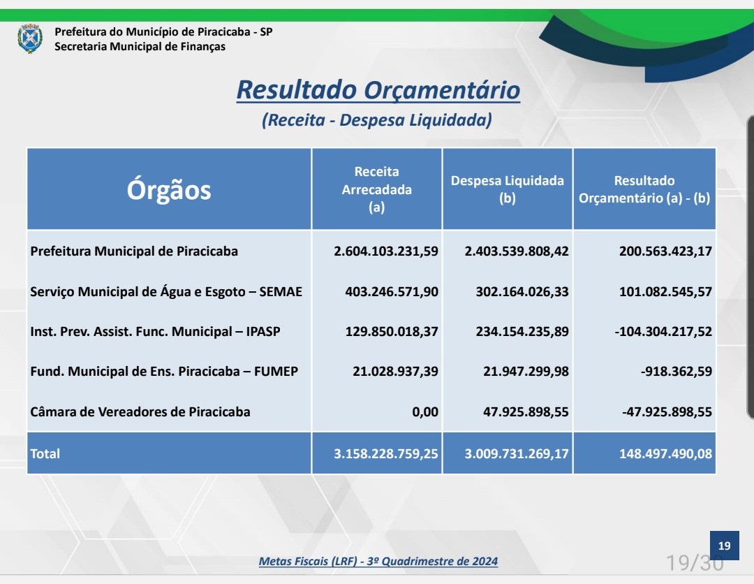 Deixo claro esses dados conforme apresentação da própria prefeitura sobre o fechamento do ano de 2024, apresentados em audiência pública na Câmara Municipal de Piracicaba: