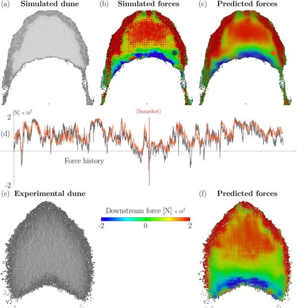 (a) Vista superior de duna barcana subaquática obtida a partir de simulação numérica, mostrando sua topologia. (b) Forças instantâneas sobre a duna, calculadas por simulação numérica. (c) Predição das forças obtida por rede neural convolucional (CNN). (d) Histórico temporal da força indicada. (e) Vista superior de duna subaquática obtida a partir de experimento. (f) Forças instantâneas sobre a duna real, estimadas pela CNN (imagem: Erick Franklin et al./Geophysical Research Letters)