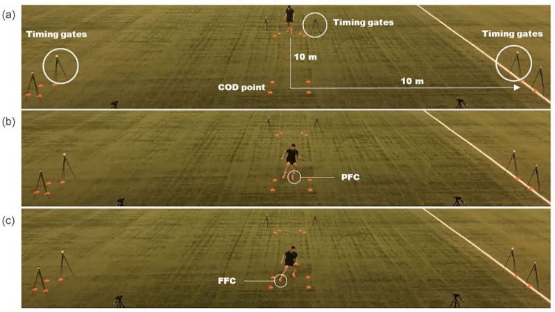 (a) Visão geral do teste de mudança de direção (COD) e posicionamento dos medidores de tempo; (b) Penúltimo contato do pé (PFC) para medir estratégias de frenagem; (c) Contato final do pé (FFC) para medir a estratégia de mudança de direção (imagem: João Belleboni Marques et al./KSSTA)
