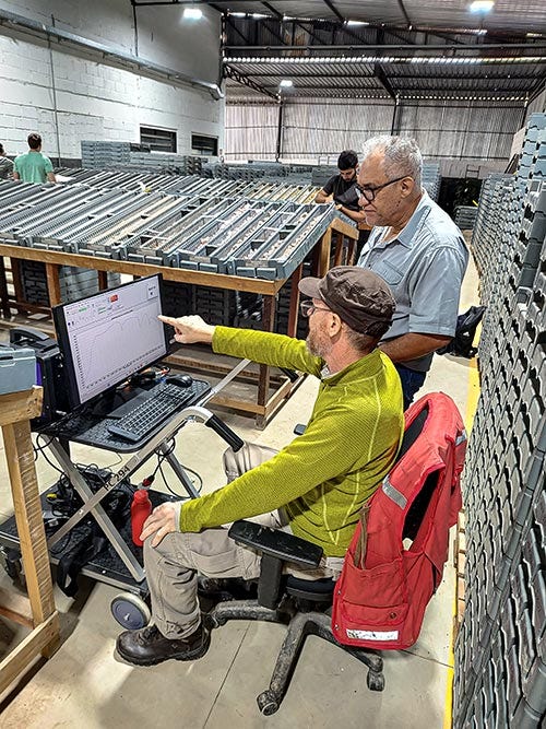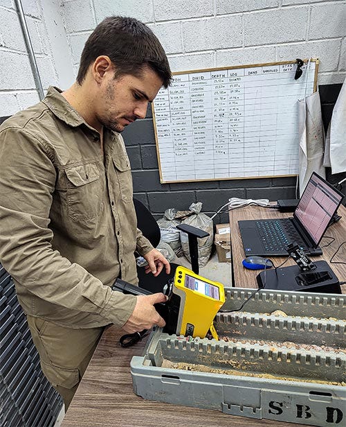 Diferentemente de muitos minerais metálicos, a caracterização correta dos ETRs exige técnicas analíticas avançadas. Tais elementos não são identificados a olho nu, nem mesmo com métodos tradicionais de campo, como a lupa de mão. Para superar esses desafios em Poços de Caldas, “a equipe utilizou equipamentos portáteis de última geração, capazes de gerar dados em tempo real diretamente nos testemunhos de sondagem”, segundo Ducart.