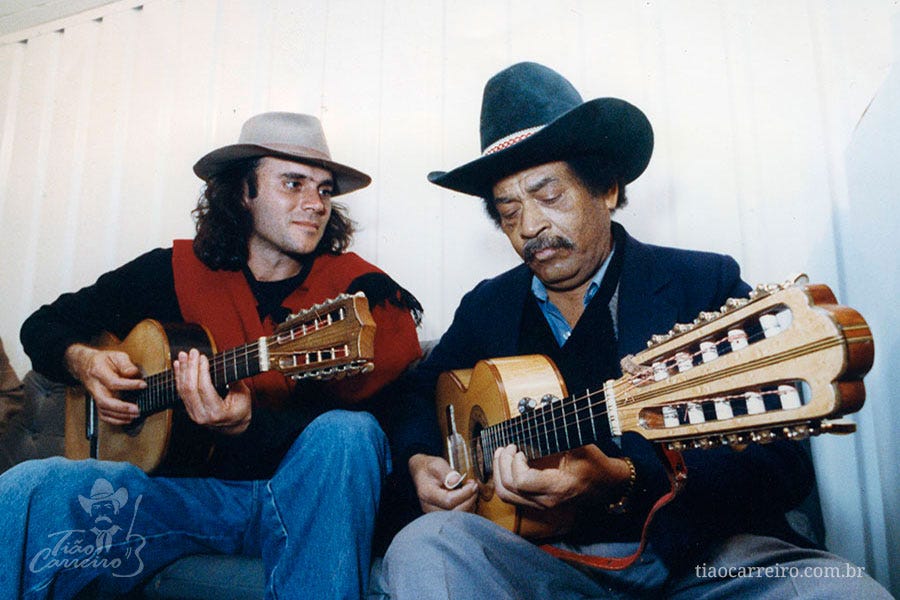 Tião Carreiro era preto. O pagode sertanejo tem raízes fortes em ritmos musicais criados por escravos, como o jongo e o samba sertanejo. Antes que me acusem de woke, politicamente correto: não afirmo que a música dele é melhor ou pior por causa da sua ancestralidade africana. E sim, porque ela é boa. Por quais critérios? Ouça, e se não tiver preconceitos (musicais), prestar atenção nas letras e entrar no ritmo da viola, nem preciso explicar muita coisa.