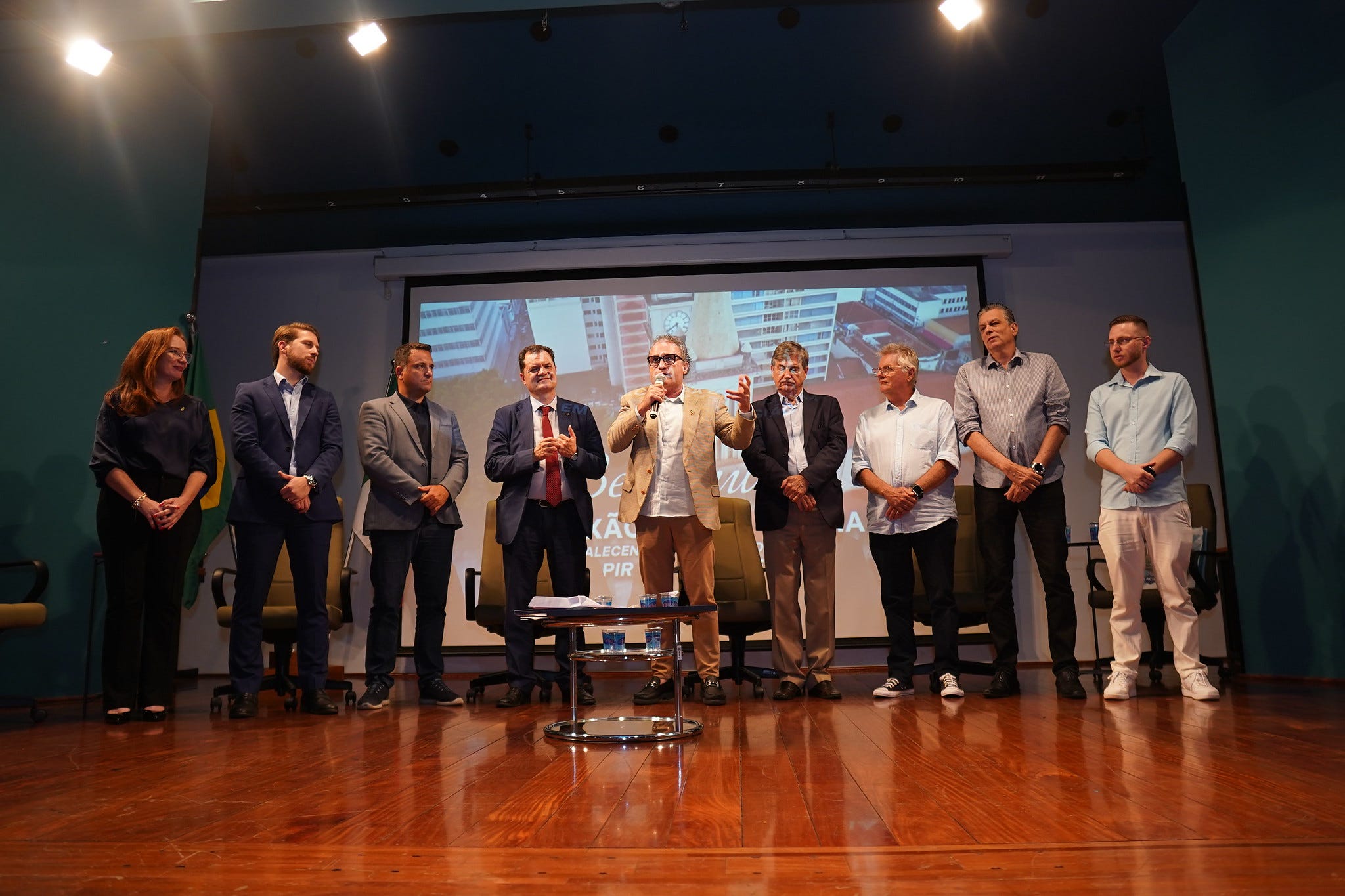 Deputado italiano Fábio Porta durante palestra na Acipi, ao lado da Conselheira dos Comitês Italianos Fernanda Mercurio, Lucas Ballotta - Presidente Núcleo Jovem da Società Italiana Piracicaba, Juliano Dorizotto, Presidente da Società Italiana di Piracicaba, Salvatore Milanese - Secretário do (PD) Partido Democrático da Italia no Brasil e Fausto Longo (ex-senador italiano)