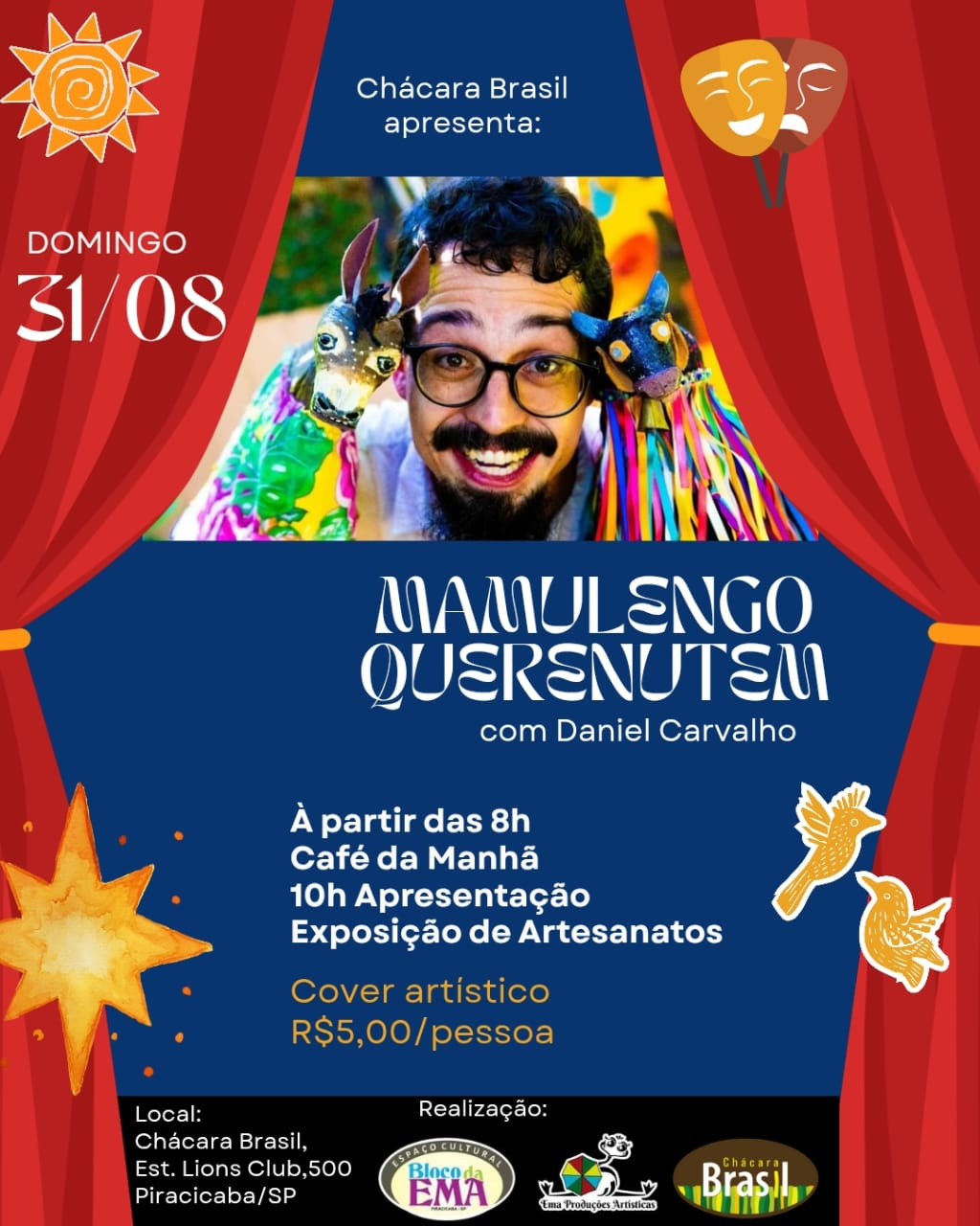 O Mamulengo Querenutem, com Daniel Carvalho, estará na Manhã Cultural da Chácara Brasil (Estrada Lions Club, 500 - Piracicaba-SP), no domingo (31), a partir das 10 horas. A festa no local começa mais cedo, às 8 horas, com café da manhã.
