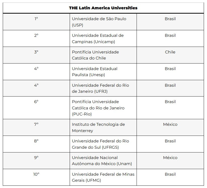 O Brasil tem sete das dez universidades mais bem classificadas. Além da USP, que lidera o ranking, figuram no top 10 a Universidade Estadual de Campinas (Unicamp), na 2ª posição; a Universidade Estadual Paulista (Unesp) e a Universidade Federal do Rio de Janeiro (UFRJ), empatadas na 4ª posição; a Pontifícia Universidade Católica do Rio de Janeiro (PUC-Rio), no 6º lugar; a Universidade Federal do Rio Grande do Sul (UFRGS), no 8º; e a Universidade Federal de Minas Gerais, no 10º.