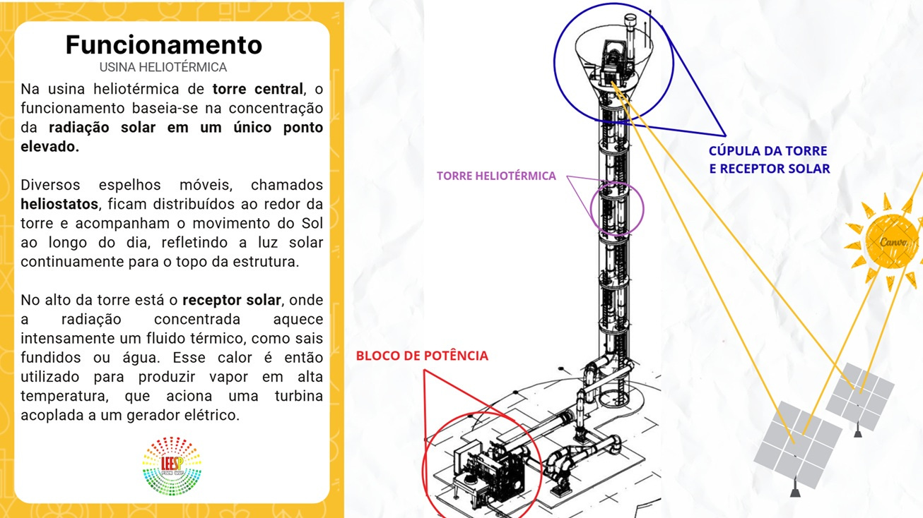 O sistema heliotérmico de geração de energia elétrica utiliza a irradiação solar para gerar calor, aquecer um fluido que se transforma em vapor e movimenta uma turbina, produzindo energia elétrica. O princípio é o mesmo das usinas termelétricas, mas, ao invés de utilizar combustíveis fósseis e poluentes, como o carvão mineral, o sistema heliotérmico utiliza a energia solar, uma fonte totalmente limpa e renovável, com zero emissões de gases de efeito estufa.