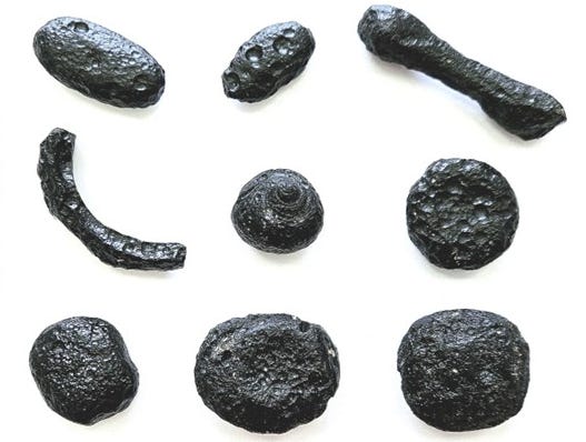 Até julho de 2025, os autores reuniram cerca de 500 espécimes, número que já ultrapassa agora 600 unidades com os achados mais recentes. Os fragmentos variam de menos de 1 grama até 85,4 gramas, com tamanhos que chegam a cerca de 5 centímetros no maior eixo. As formas são típicas de tectitos aerodinâmicos: esféricas, elipsoidais, em gotas, discoides, em halteres ou torcidas.