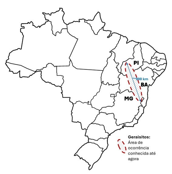 Os geraisitos foram localizados inicialmente em três municípios do norte de Minas Gerais – Taiobeiras, Curral de Dentro e São João do Paraíso – numa faixa com cerca de 90 quilômetros de extensão. Desde a submissão do artigo, novas ocorrências foram registradas também na Bahia e, mais recentemente, no Piauí, ampliando a área conhecida para mais de 900 quilômetros de extensão longitudinal, segundo Crósta. “Esse crescimento da área de ocorrência é totalmente compatível com o que se observa em outros campos de tectitos no mundo. O tamanho do campo depende diretamente da energia do impacto, entre outros fatores”, explica o pesquisador.